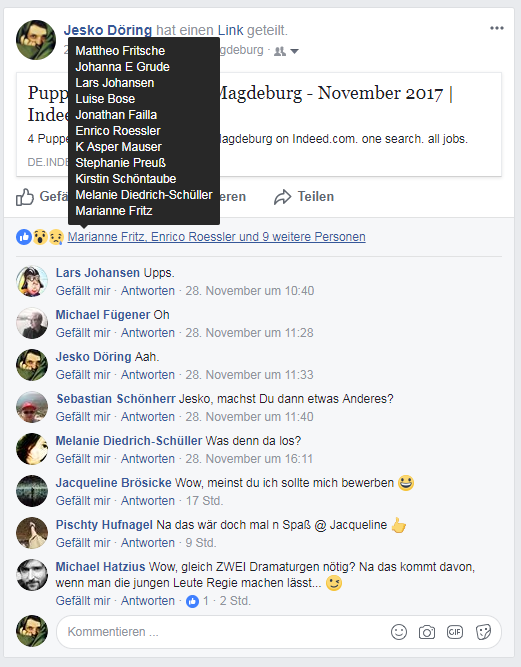 Was war passiert? Ich habe, nachdem mich gestern gegen 10:00 eine Frau anrief und sich über die ausgeschriebenen Stellen erkundigte, erstmals herausgefunden, dass es 5 Puppen-Stellenausschreibungen bei indeed und buehnenjobs gibt. Die habe ich dann ins Facebook geteilt mit der Angabe: "... richtig was los hier. Und damit: Viel Glück & Augen auf bei der Berufswahl." Das liest sich natürlich mehrdeutig, ich würde aber bestreiten, hier innerbetriebliche Informationen veröffentlicht zu haben.