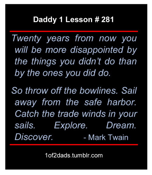 Heute habe ich wieder so einen 'blöden' Sinnspruch, diesmal von Mark Twain, gelesen, der mir allerdings gerade recht kommt: von späteren Enttäuschungen darüber, etwas nicht getan zu haben und dem Lösen der Schlingen. Die Passatwinde nutzen und los segeln. Alles nichts Neues, aber immer das Selbe. Und weiterhin mit maritimer Metapher: